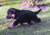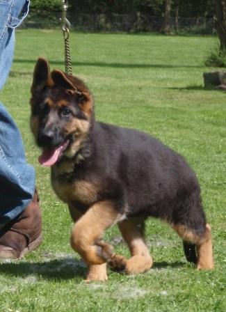 The German Shepherd Dog is slightly long, stretched, powerful and well muscled. The bones are dry and firmly developed. The ratio of height to length and placement and structure of the limbs (angulation) are so balanced that a far reaching, effortless gait is guaranteed. He has a weatherproof coat. A harmonious appearance is desired as long as the working ability of the dog is not called into question. Sex characteristics must be pronounced, as the masculinity of the males and the femininity of the females must be unmistakable.